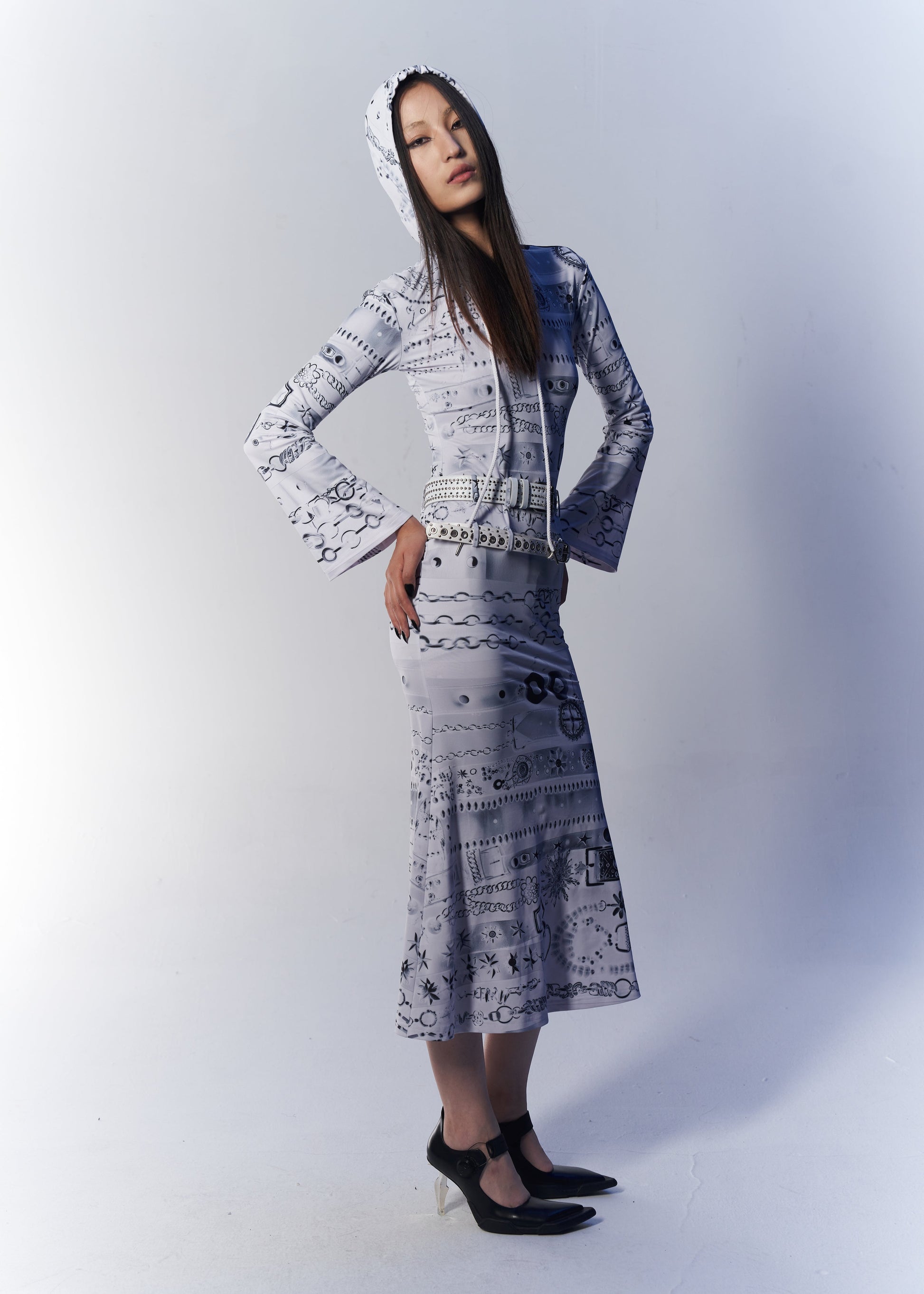 Belt Trompe l'oeil print midi dress, adjustable hood, elastic fit.