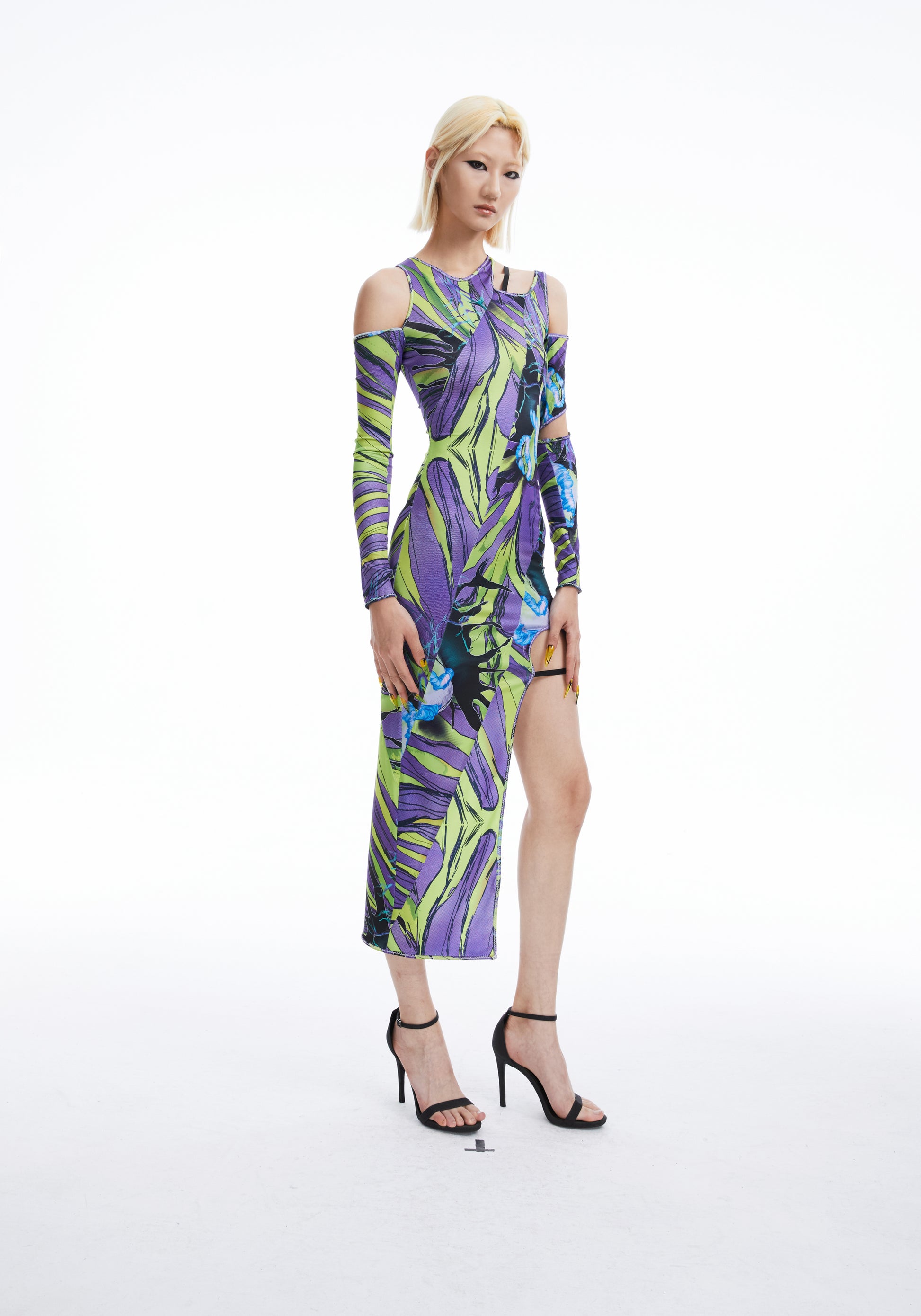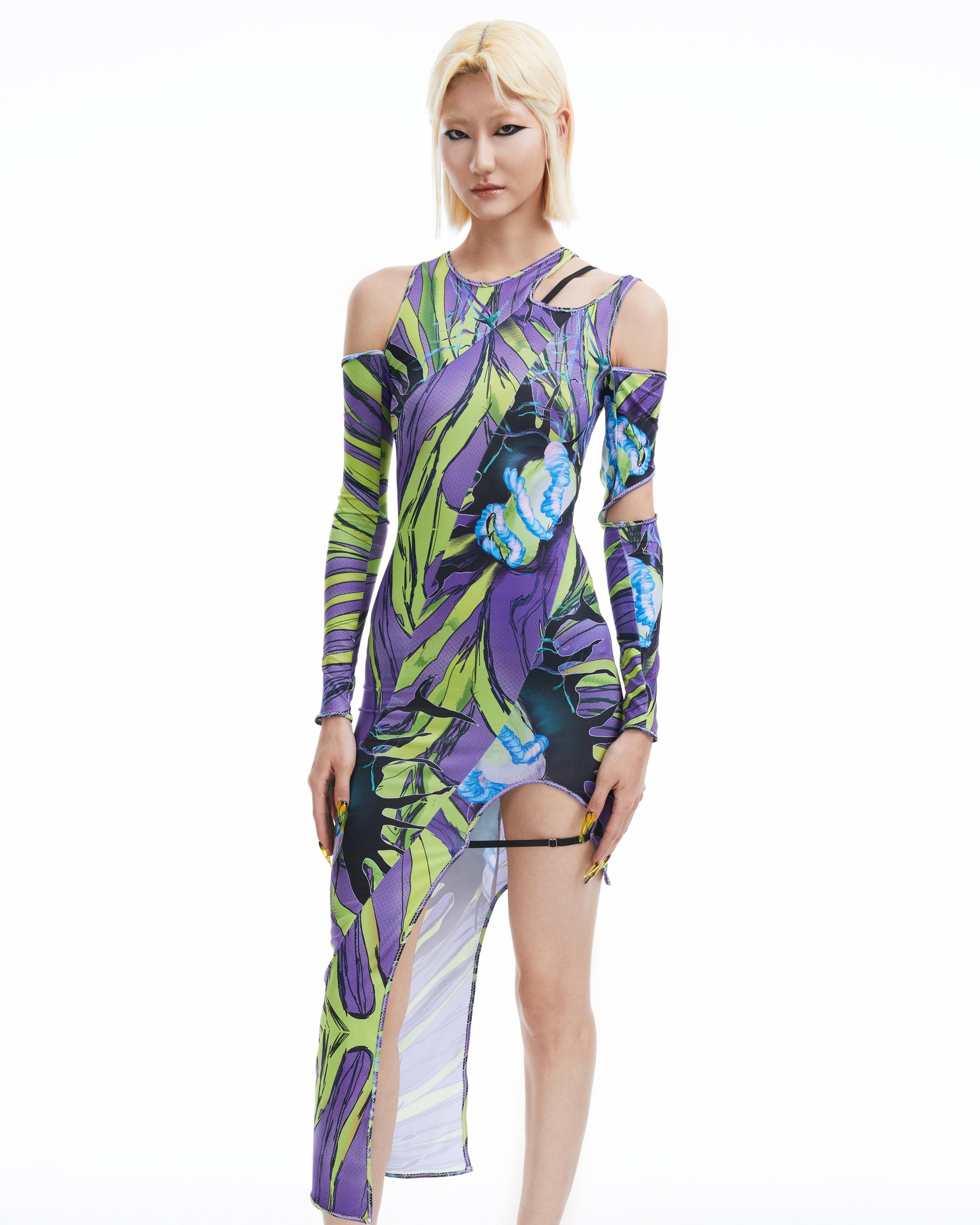 Monster lilac print cutout spandex stretch dress, cutout details on the shoulder and sleeves and left tight. elastic fit.