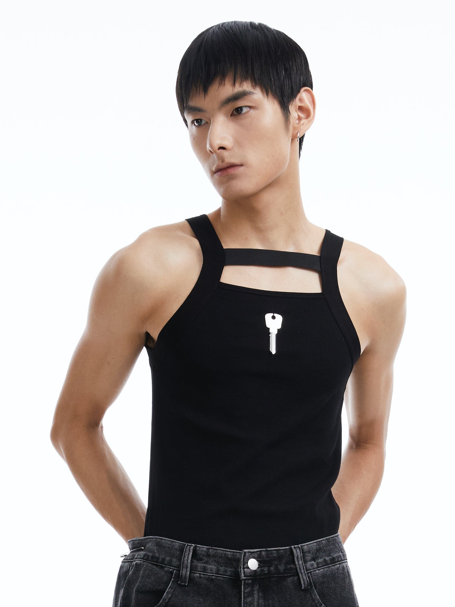 Black cotton vest with metallic key and logo, assemble and cut-out front detail.