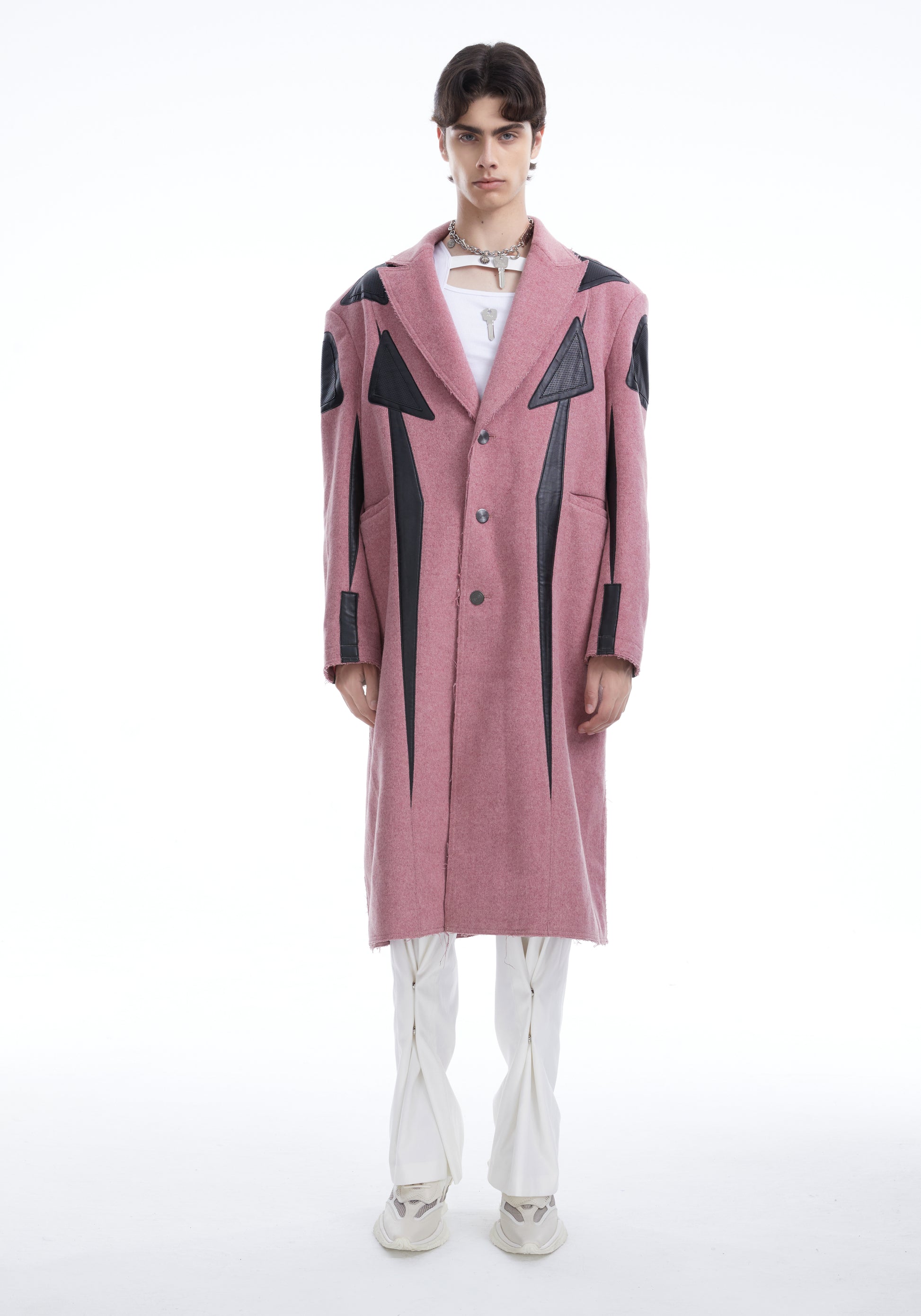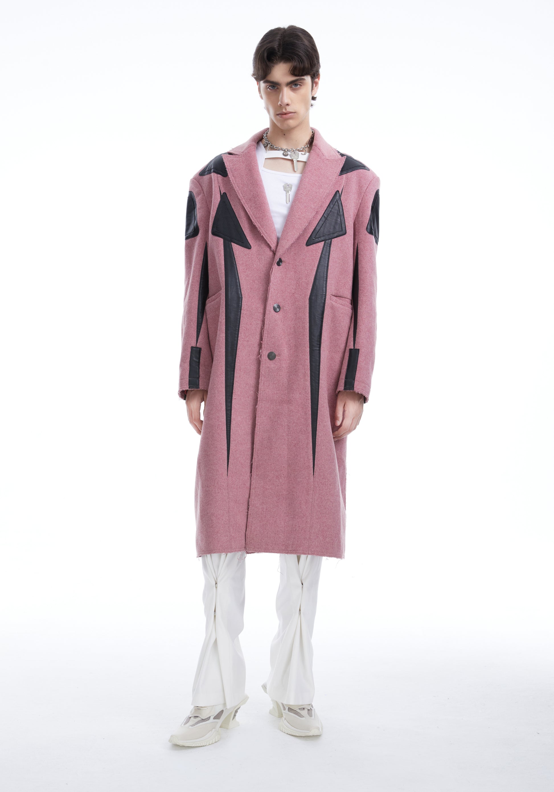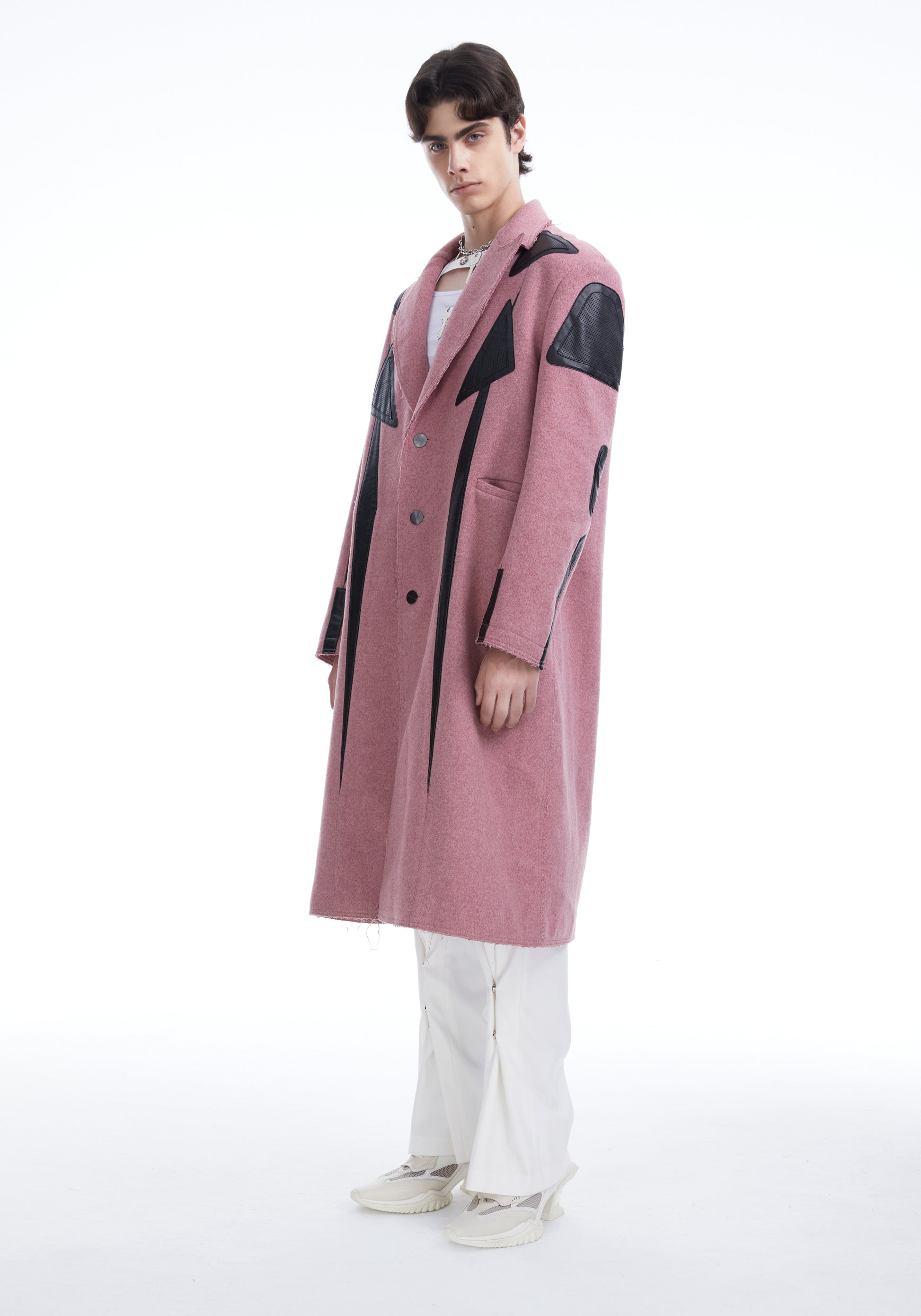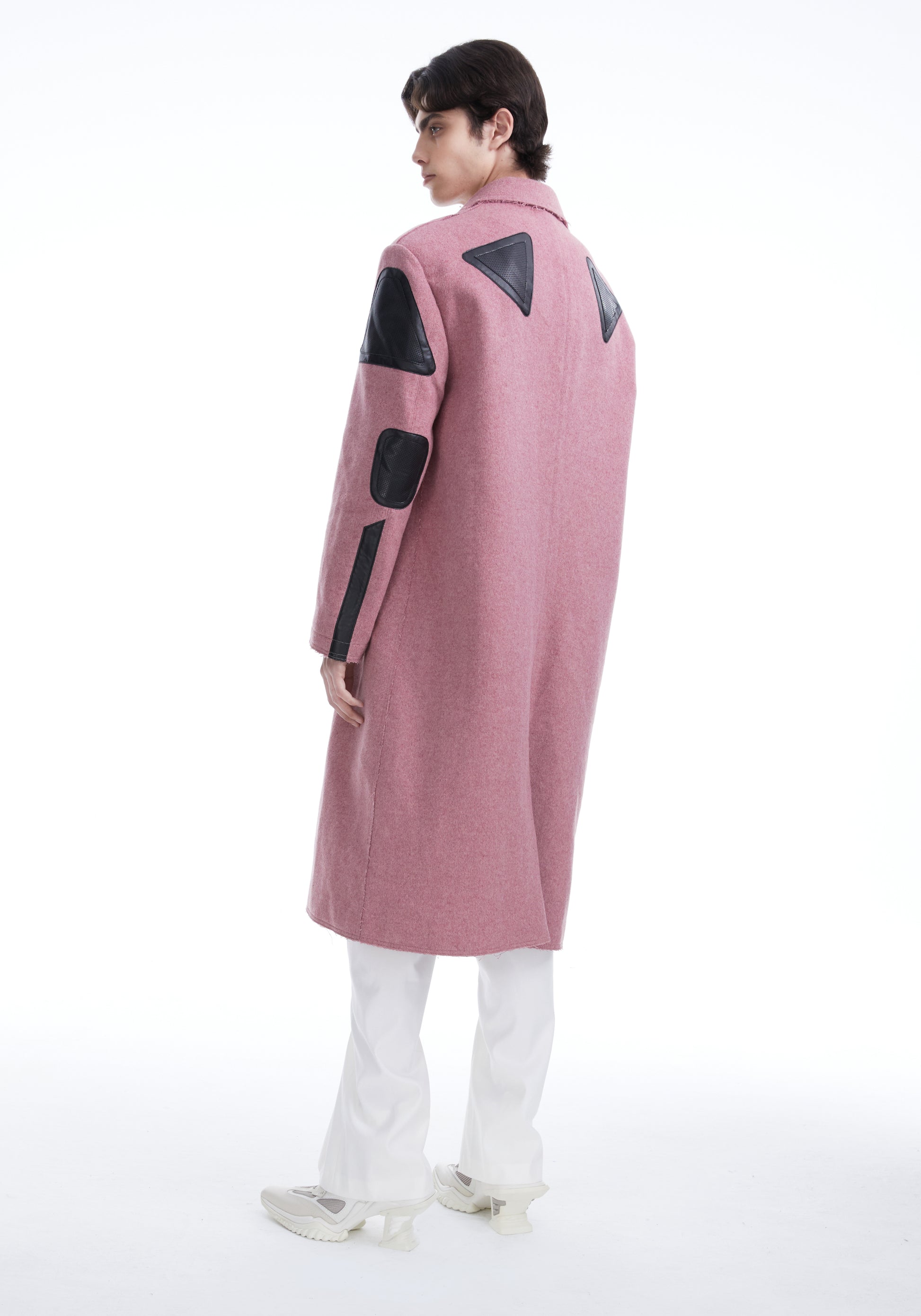 Pink wool coat featuring leather patch details inspired by car racing gear. This oversized coat is made from heavyweight wool and comes with a full lining for added comfort. It has a button fastening for easy wear.