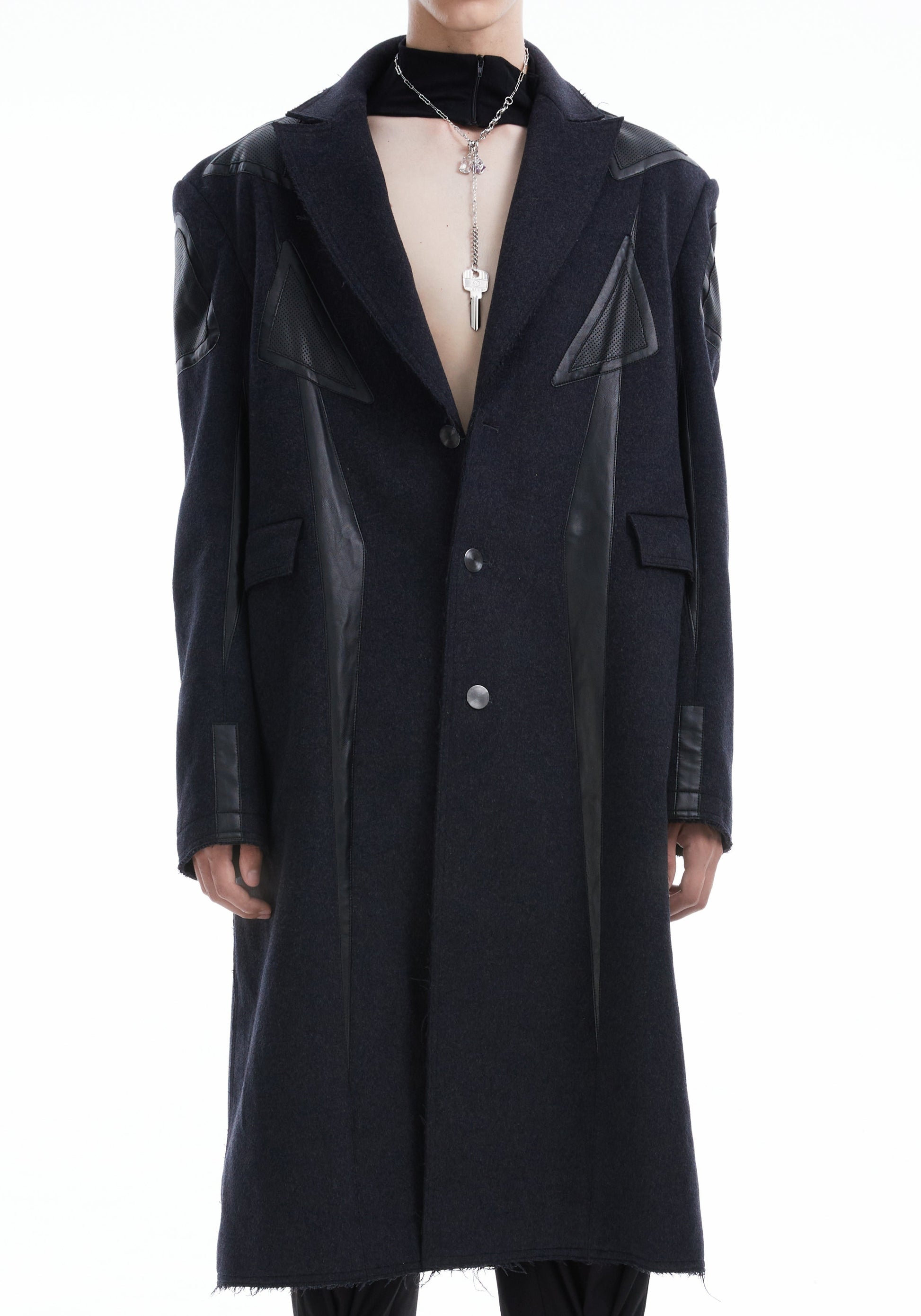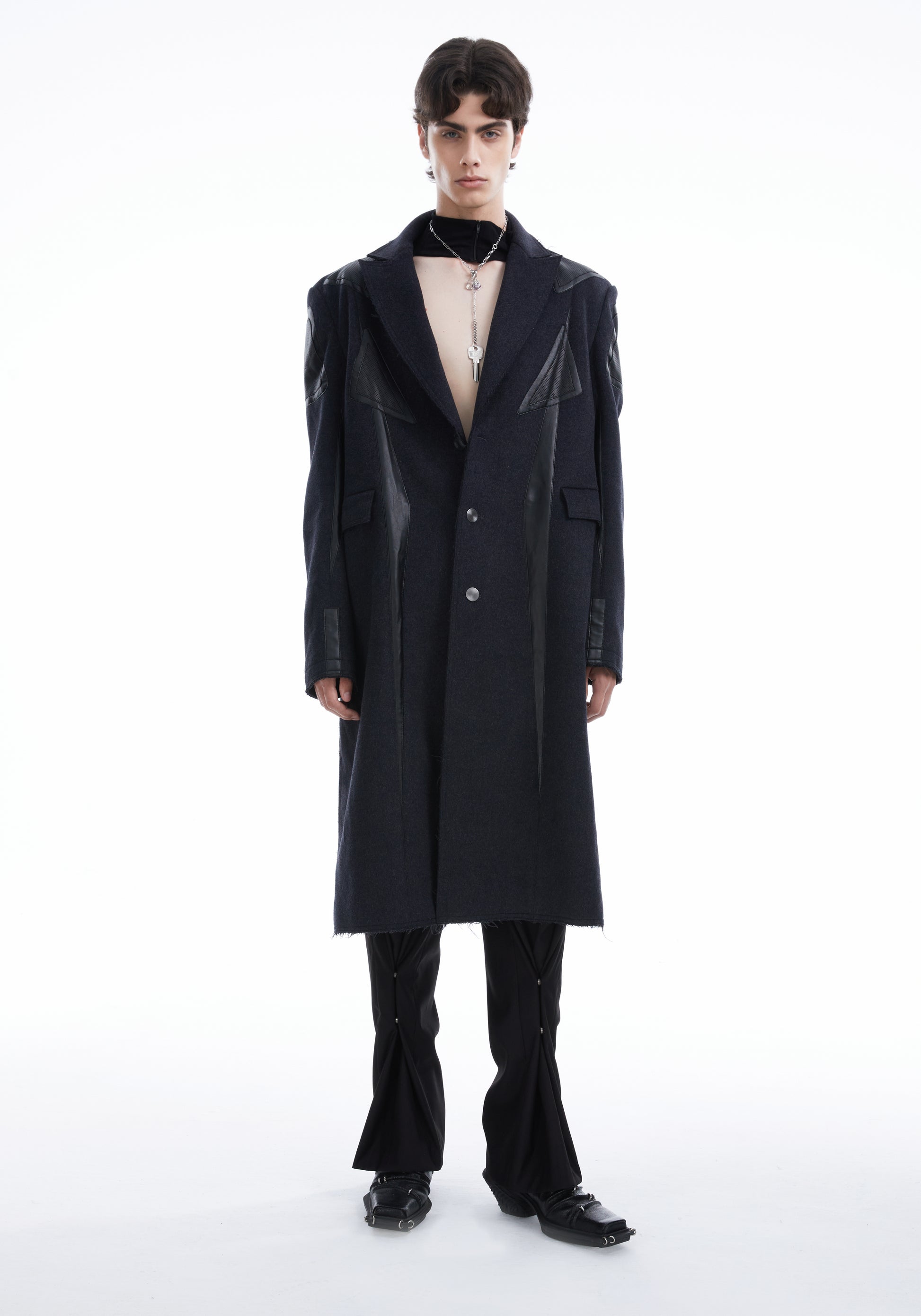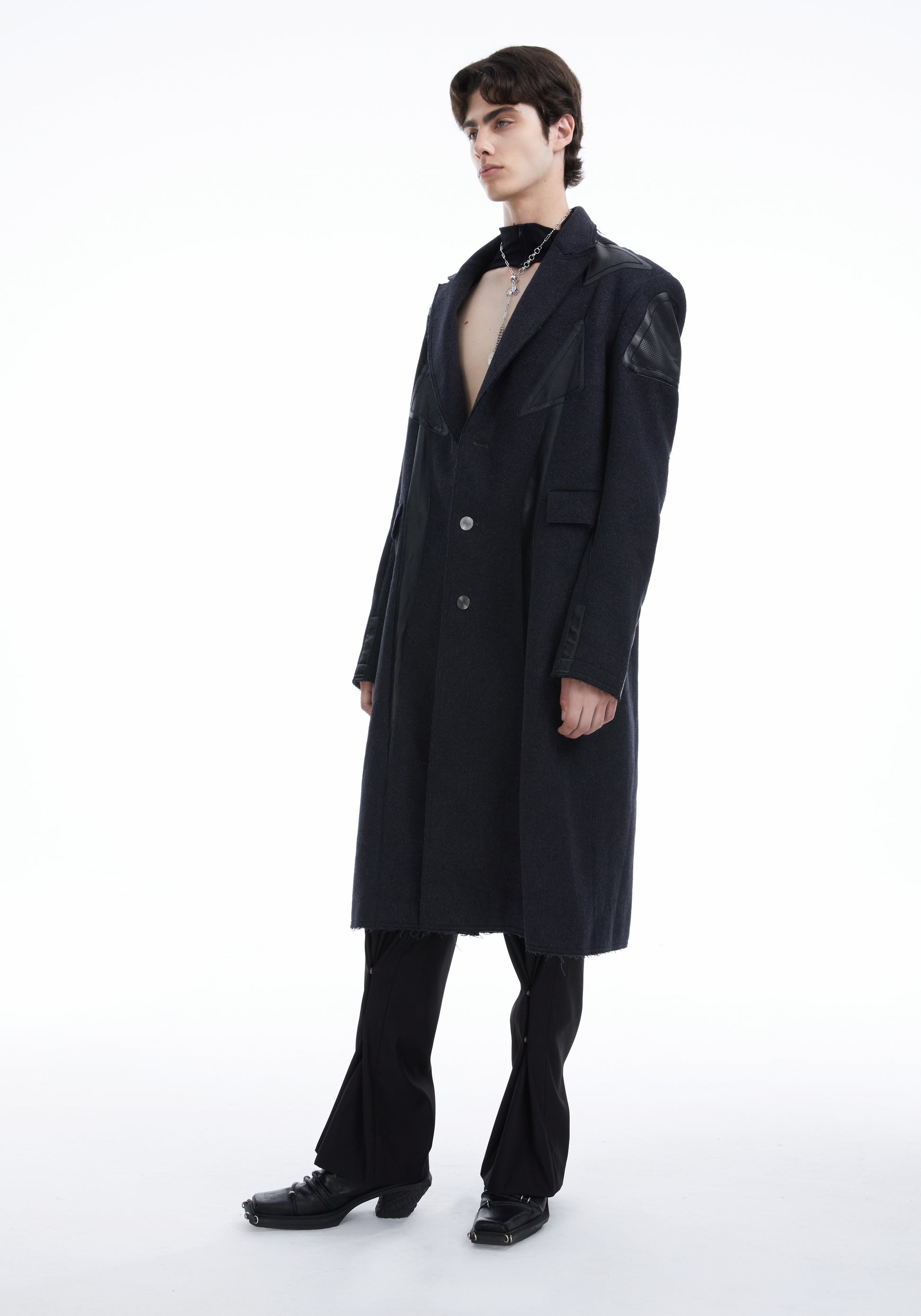 Black wool coat featuring leather patch details inspired by car racing gear. This oversized coat is made from heavyweight wool and comes with a full lining for added comfort. It has a button fastening for easy wear.