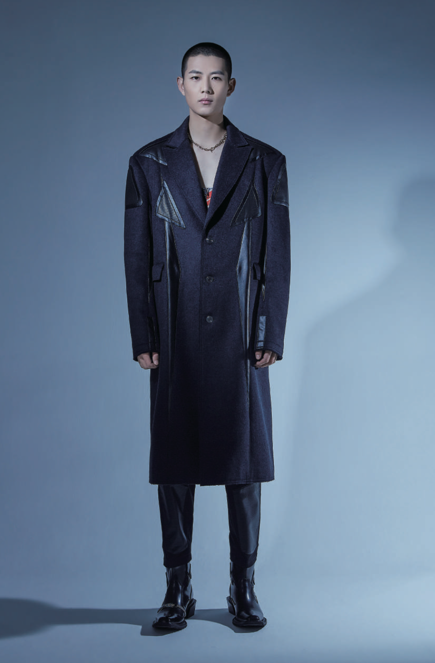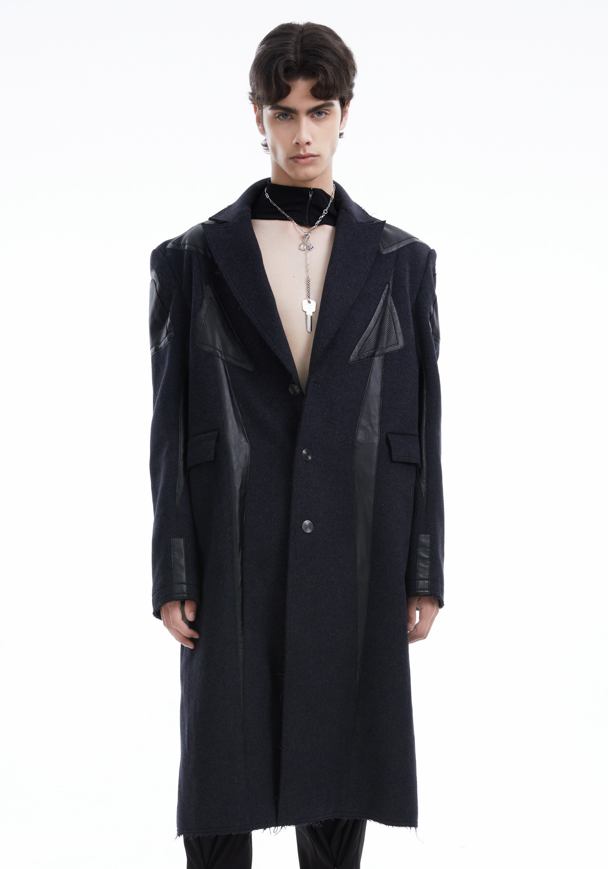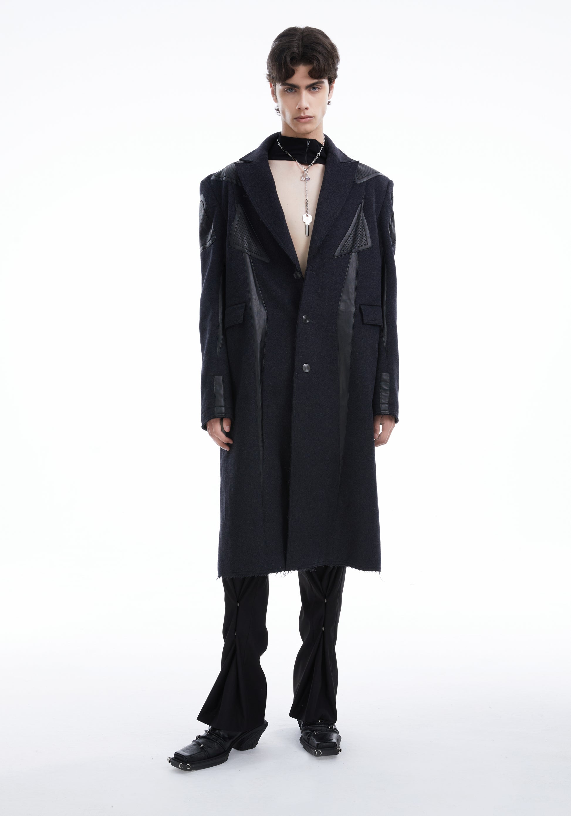 Black wool coat featuring leather patch details inspired by car racing gear. This oversized coat is made from heavyweight wool and comes with a full lining for added comfort. It has a button fastening for easy wear.