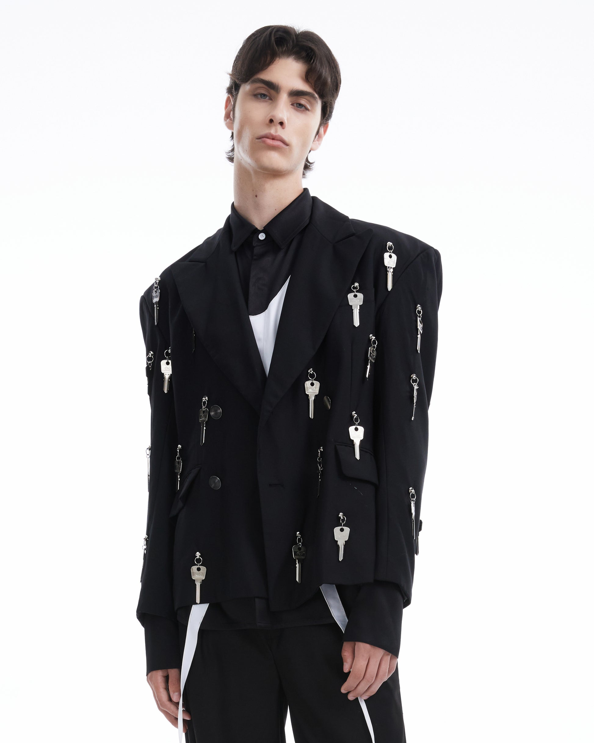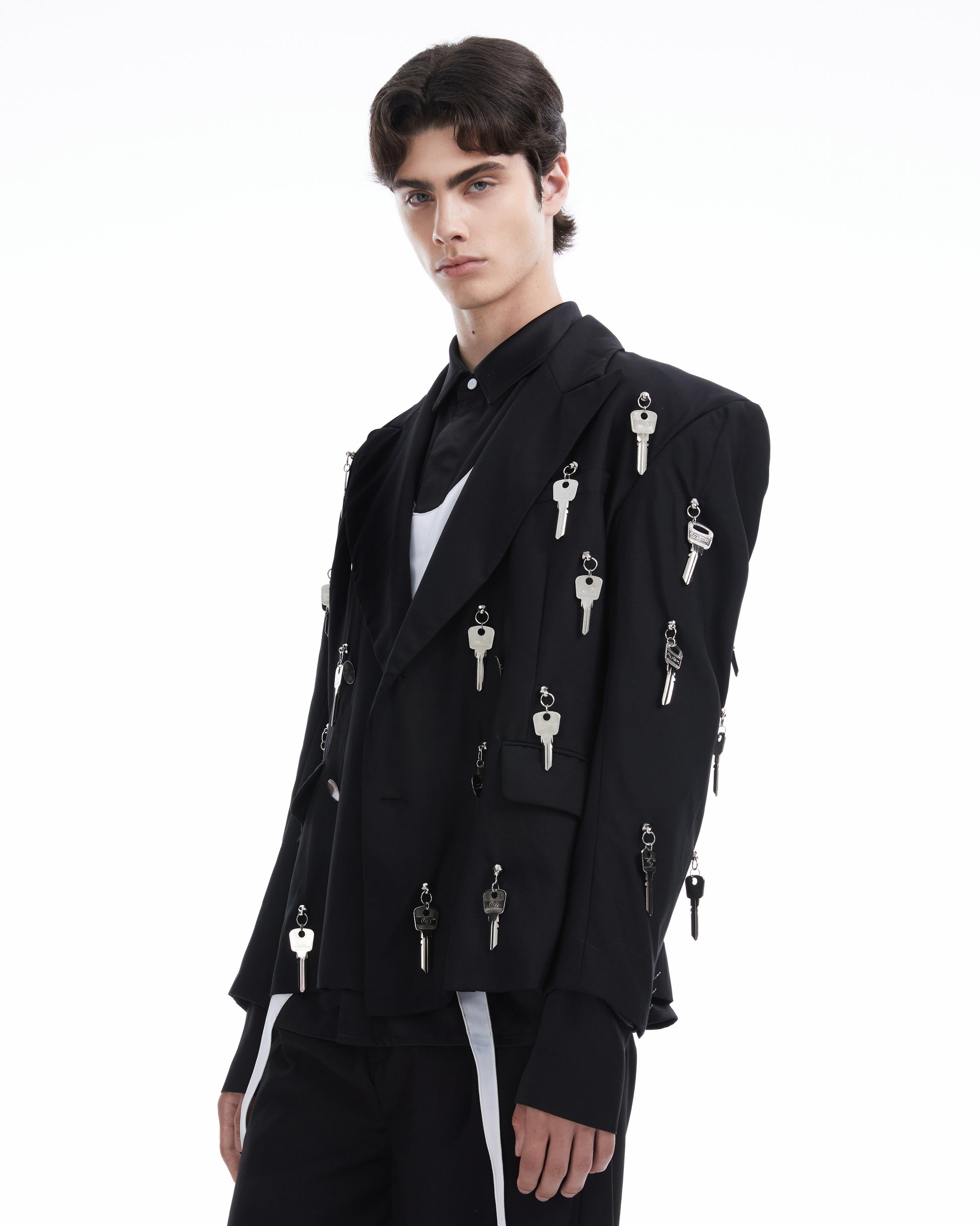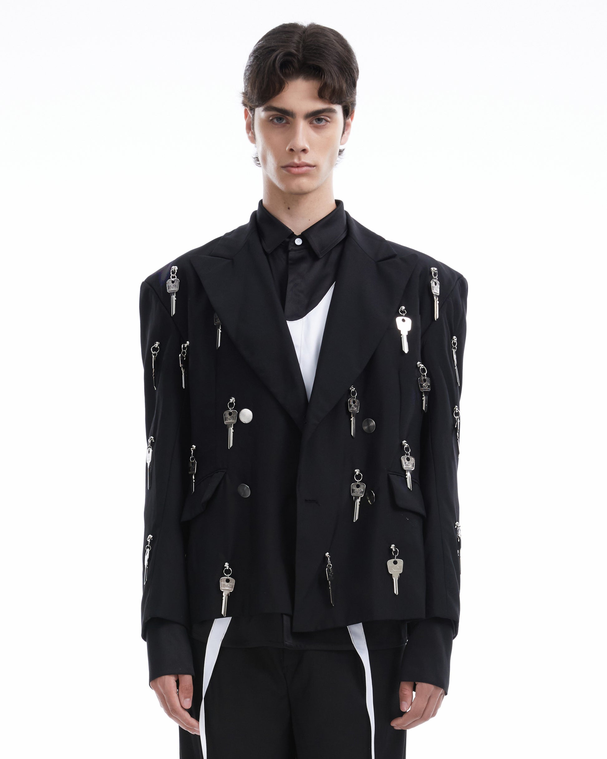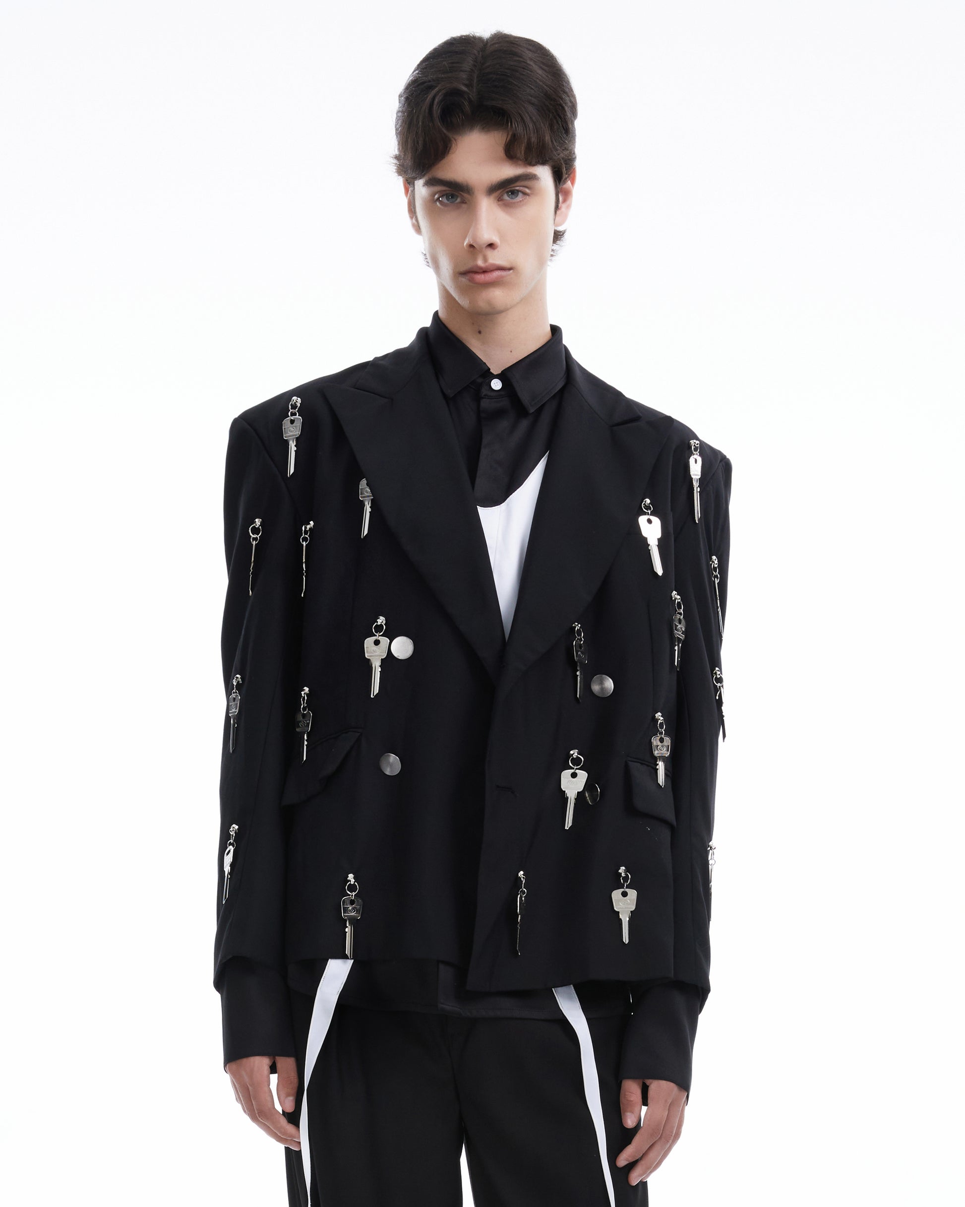 Double-breasted black blazer made from 100% wool, featuring a peak lapel, stainless steel studs, and a key assembly, with a loose fit and full lining.