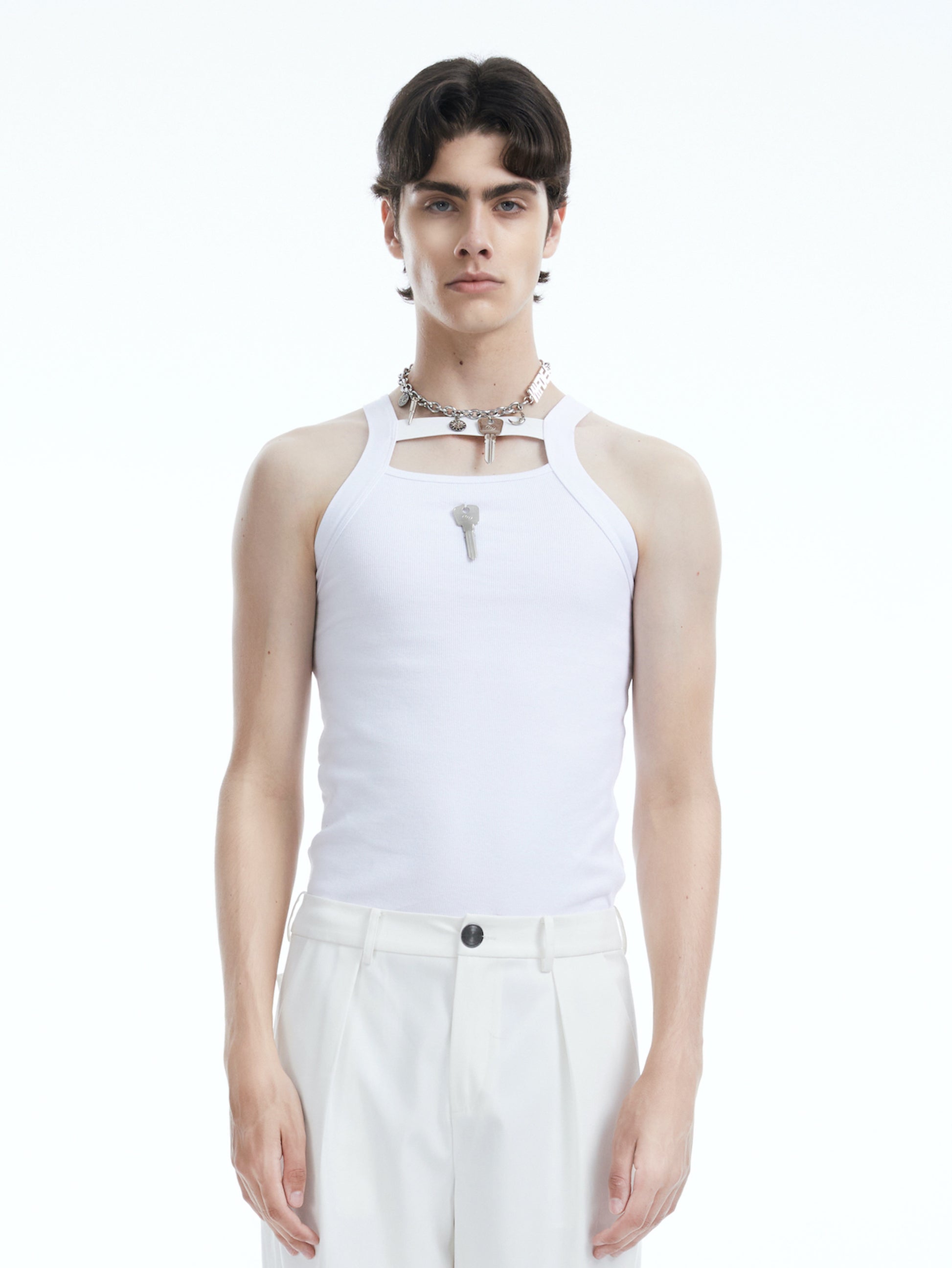 White cotton vest with metallic key and logo assemble and cut-out front detail.