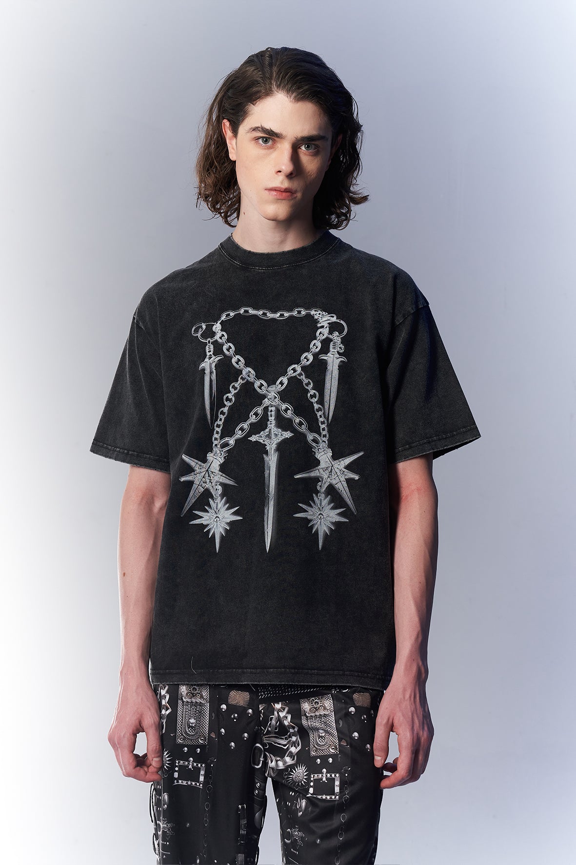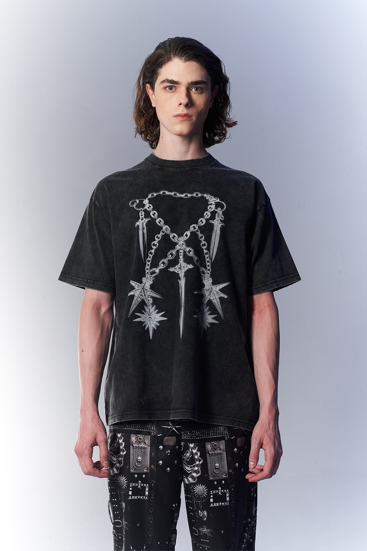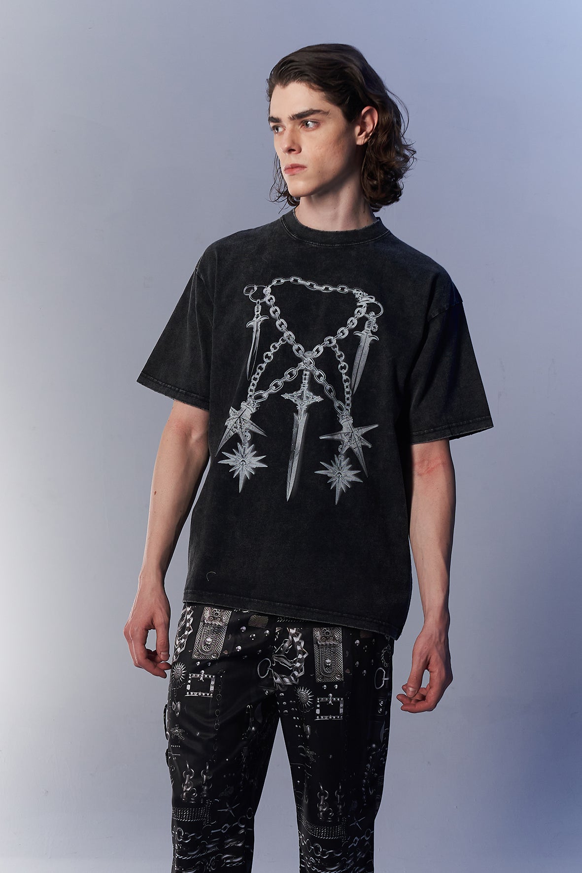 Washed black oversized t-shirt, heavy-weight cotton, subtle distressed detail on neck and hem, with large chain print at front.