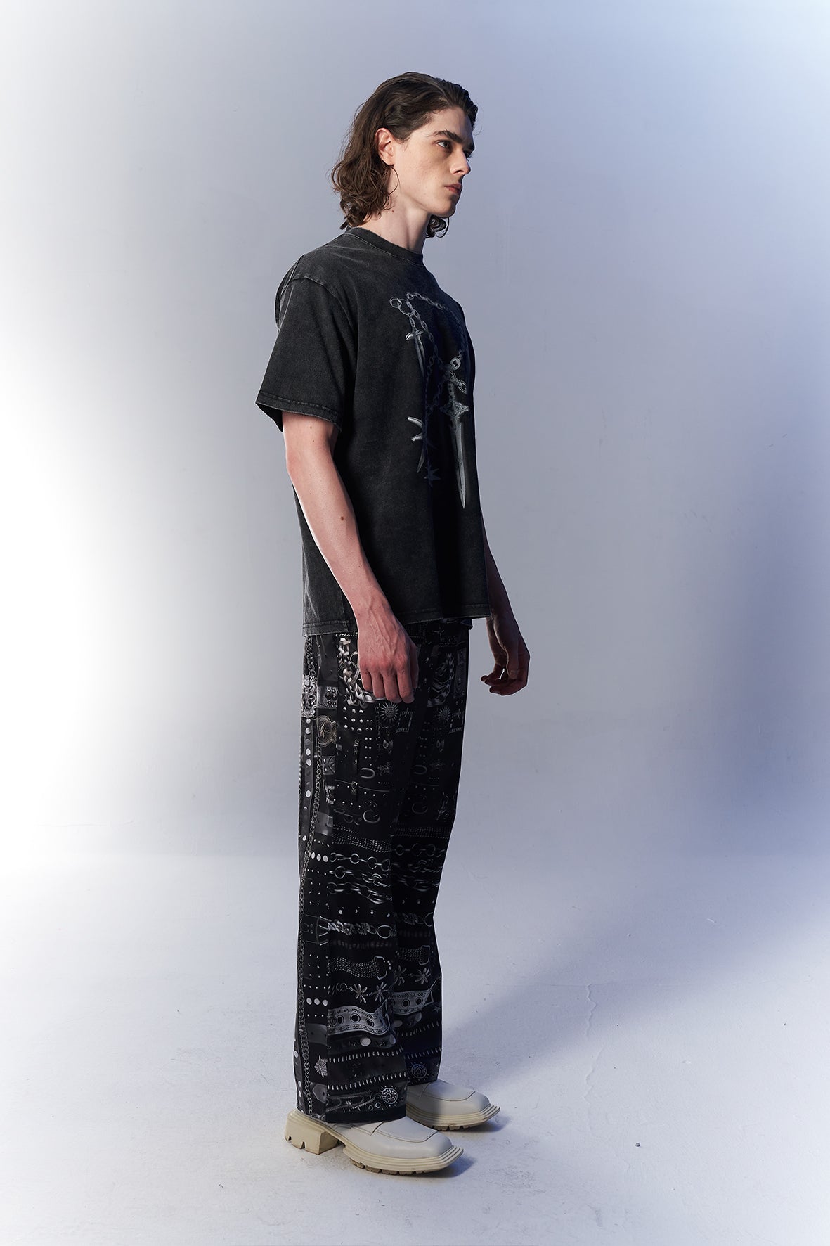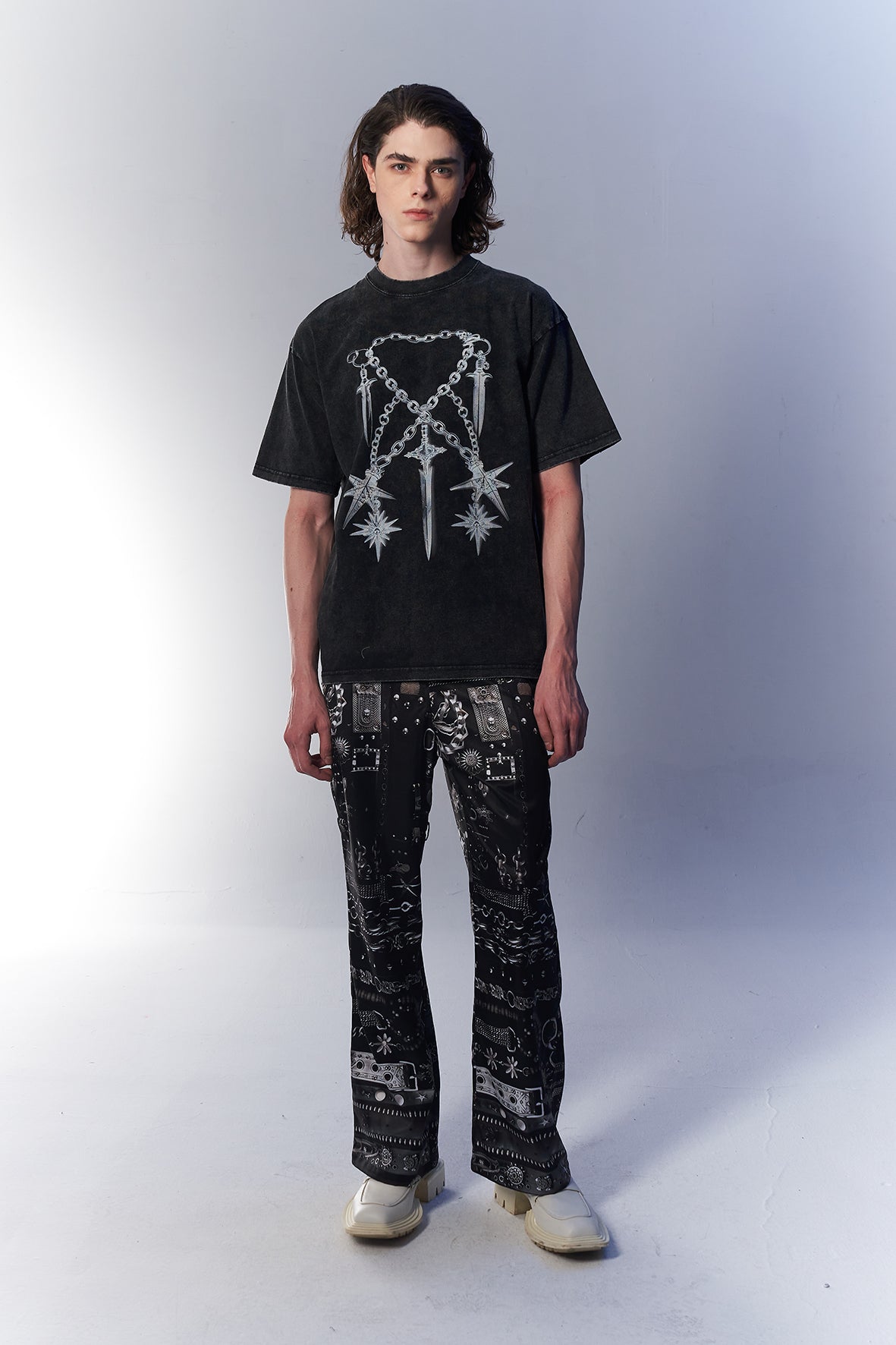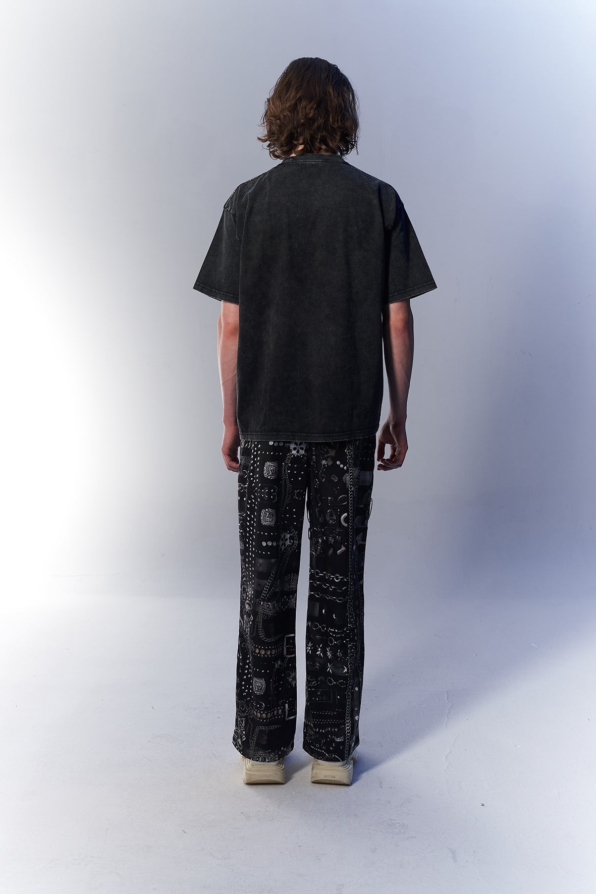 Washed black oversized t-shirt, heavy-weight cotton, subtle distressed detail on neck and hem, with large chain print at front.