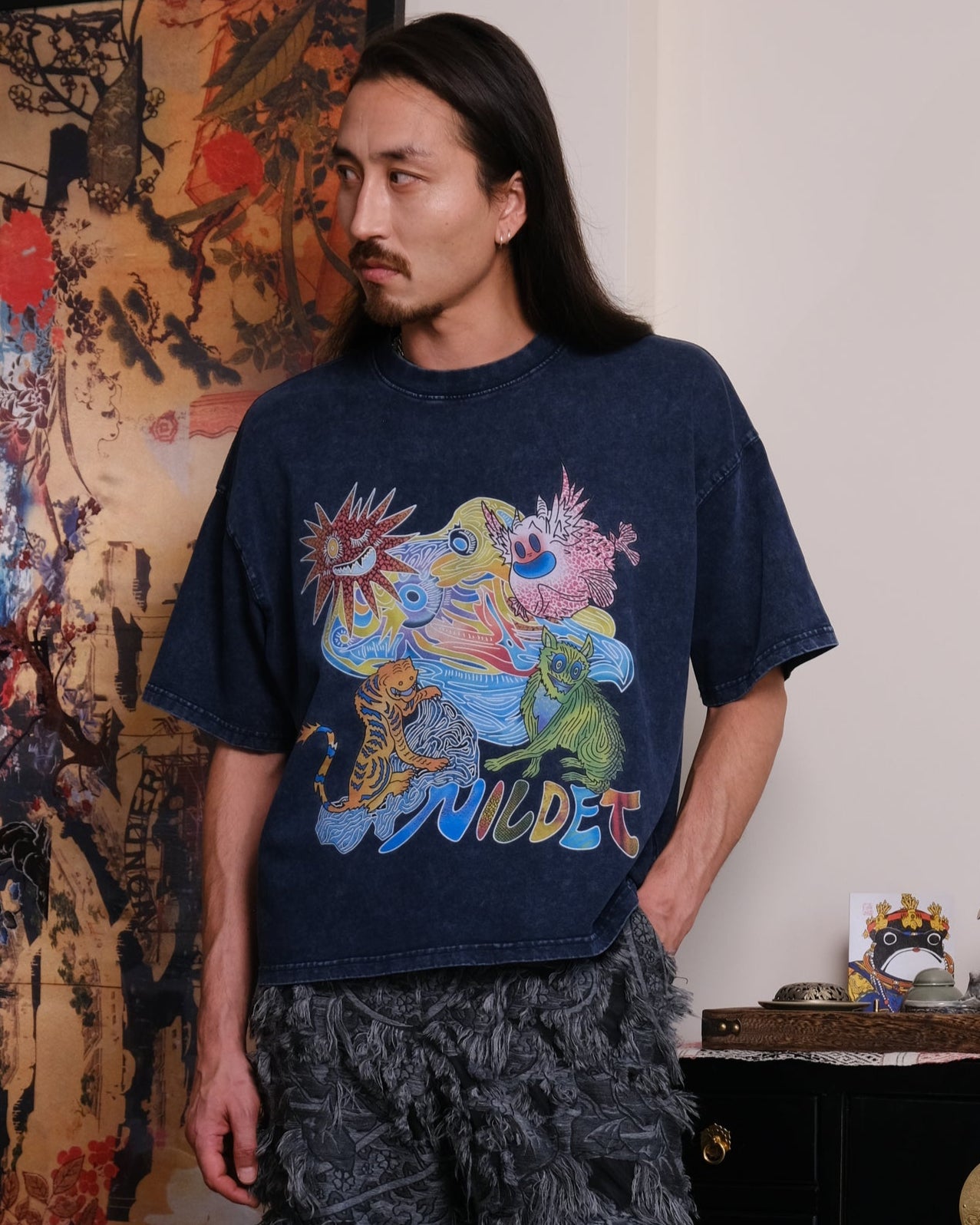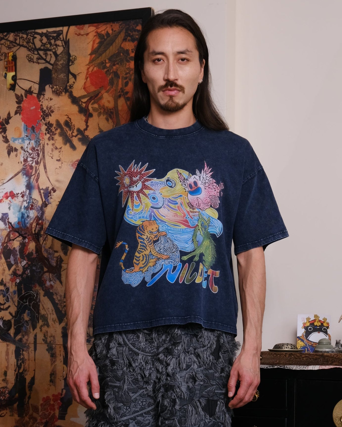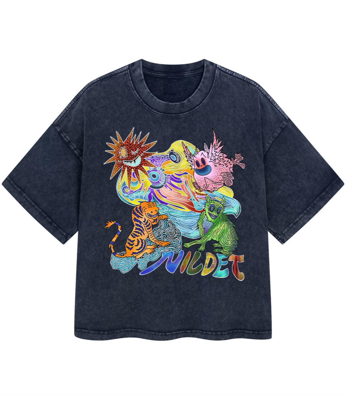Crop Unisex t-shirt, loose fit, heavy-weight cotton, stone-wash texture, original hand-drawn print inspired by the Ancient mythical creature from "Classic of Mountains and Seas".