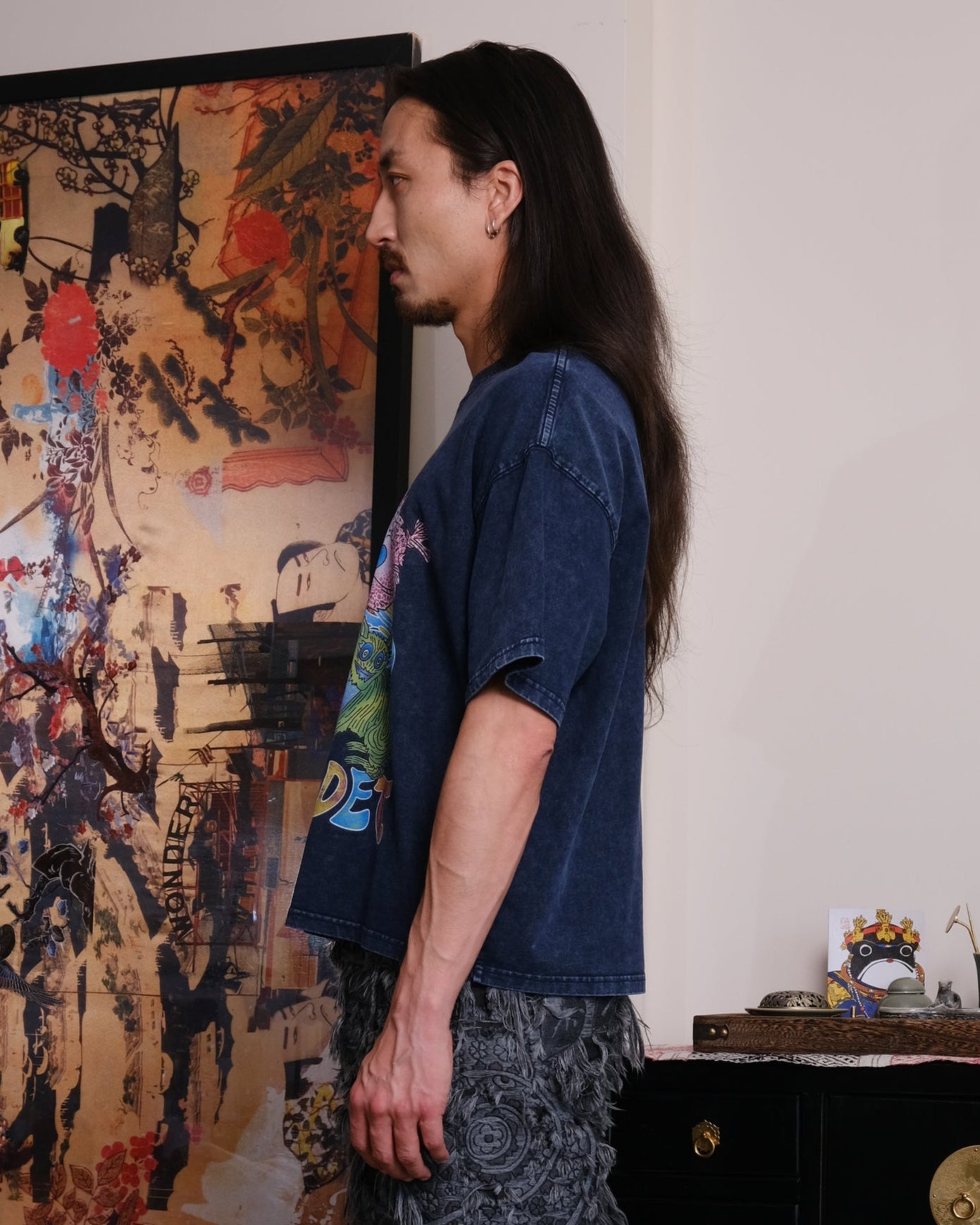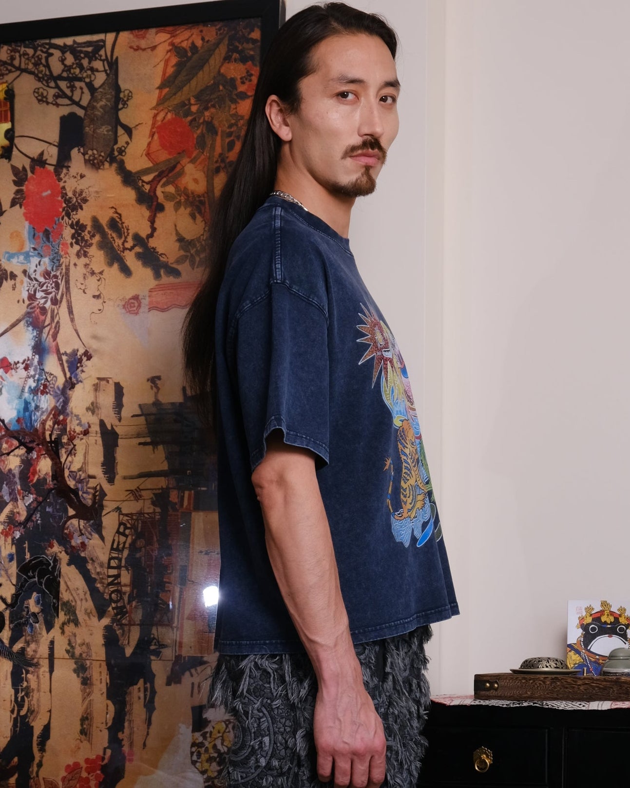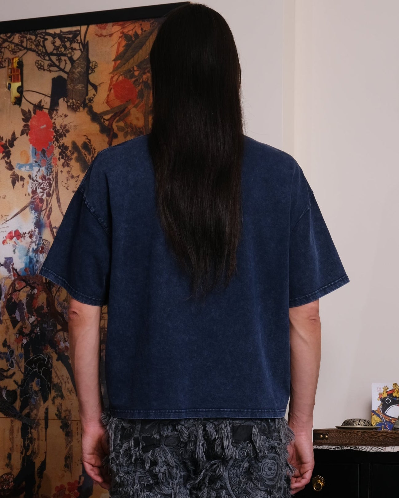 Crop Unisex t-shirt, loose fit, heavy-weight cotton, stone-wash texture, original hand-drawn print inspired by the Ancient mythical creature from "Classic of Mountains and Seas".