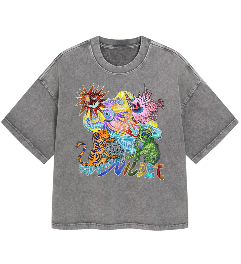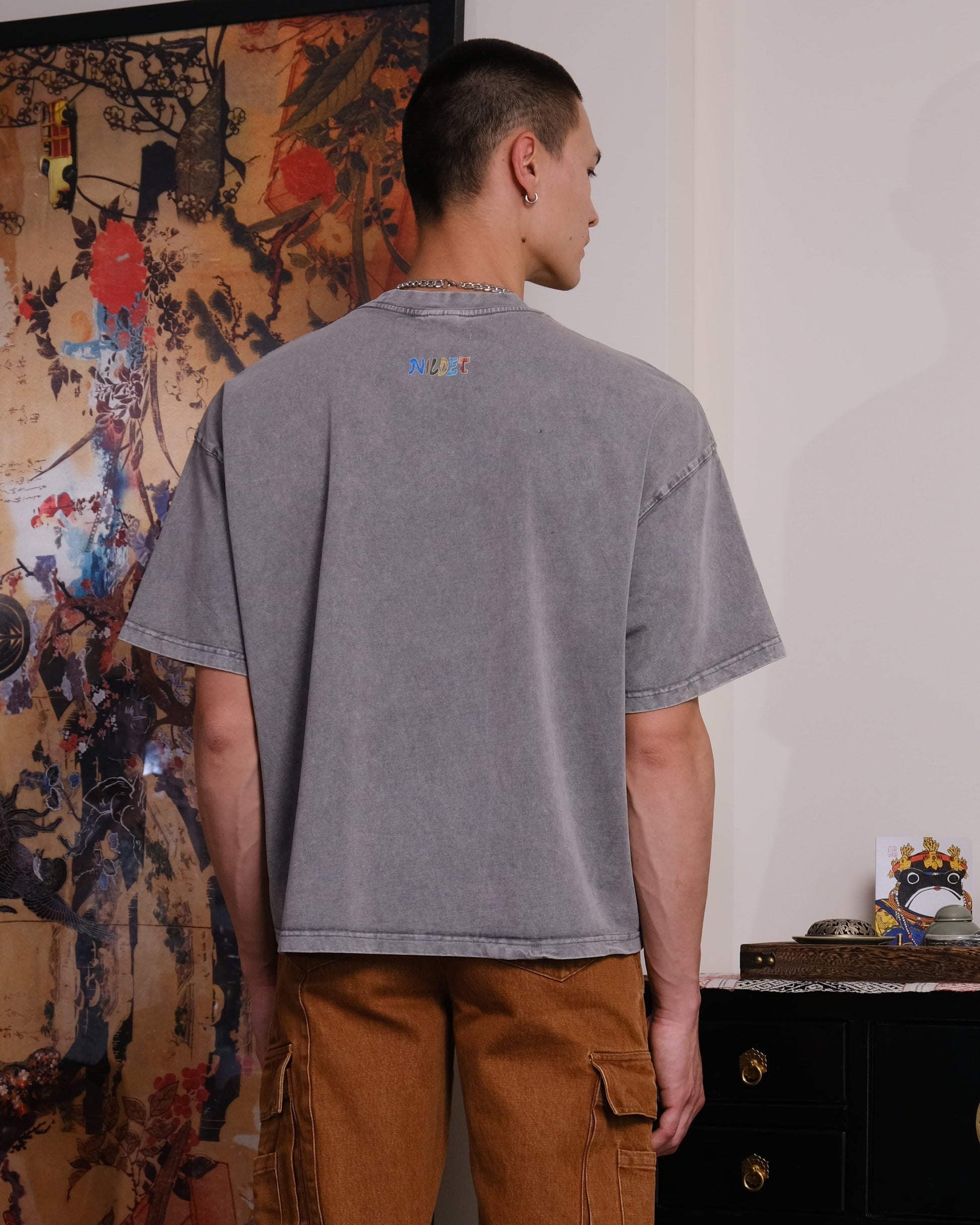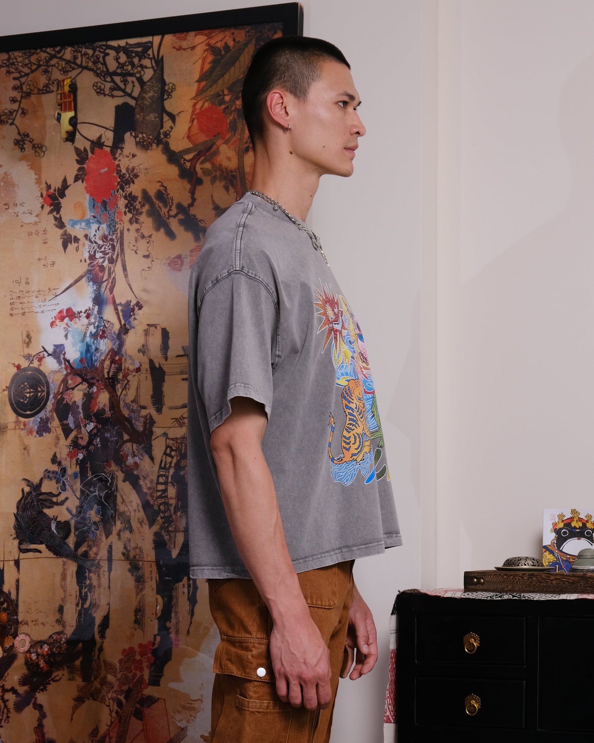 Crop Unisex t-shirt, loose fit, heavy-weight cotton, stone-wash texture, original hand-drawn print inspired by the Ancient mythical creature from "Classic of Mountains and Seas".